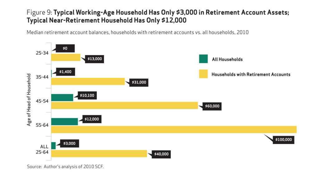 The average working household has virtually no retirement savings. When all households are included— not just households with retirement accounts—the median retirement account balance is $3,000 for all working-age households and $12,000 for near-retirement households. Two-thirds of working households age 55-64 with at least one earner have retirement savings less than one times their annual income, which is far below what they will need to maintain their standard of living in retirement.