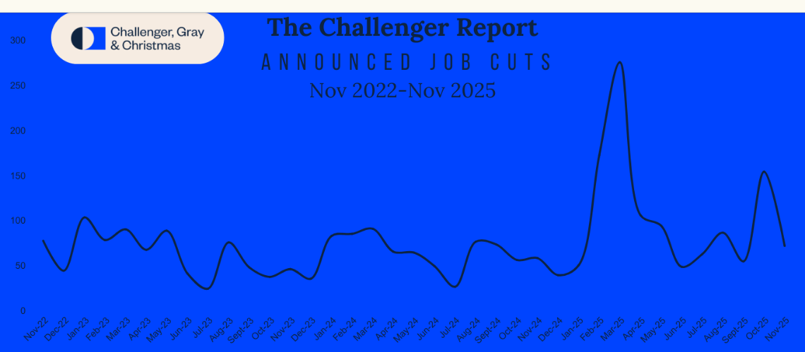 Through November, employers have announced 1,170,821 job cuts, an increase of 54% from the 761,358 announced in the first eleven months of last year. Year-to-date job cuts are at the highest level since 2020 when 2,227,725 cuts were announced through November. It is the sixth time since 1993 that job cuts through November have surpassed 1.1 million. Challenger Report: 71,321 Job Cuts on Restructurings, Closings, Economy https://www.challengergray.com/blog/challenger-report-71321-job-cuts-on-restructurings-closings-economy/