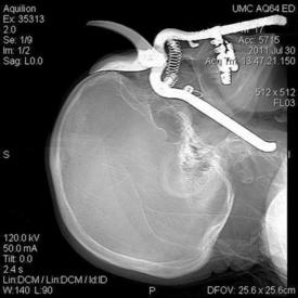 Severe pain on swallowing was the chief symptom in three of the six patients. In all three of these patients, a wire bristle from a grill-cleaning brush was found in the neck. The three included a woman aged 46 years and two men aged 50 and 64 years (Table). The three initially were evaluated with plain radiography, which identified the foreign object in each patient. One who was initially evaluated with plain radiography then underwent CT for precise localization. All three were treated successfully with laryngoscopic removal of the wire bristle.
