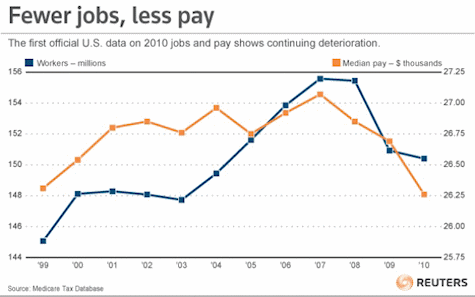 The median paycheck — half made more, half less — fell again in 2010, down 1.2 percent to $26,364. That works out to $507 a week, the lowest level, after adjusting for inflation, since 1999.