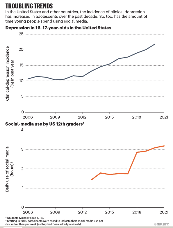 Early adolescence is characterized by wide-reaching hormonal changes, as well as physiological changes throughout the body. At the same time, all sorts of neural, cognitive and social shifts are happening. These changes could make social-media environments, such as those provided by Snapchat or TikTok, particularly alluring, but also especially impactful on mental health9–11. Several developmental-psychology studies have shown, for instance, that adolescents — particularly those in early to mid-adolescence — place increased importance on being able to interact with their peers, and on what their peers think of them12. Other studies suggest that although young children tend to view themselves positively, as they become adolescents, their ideas about themselves come to more closely align with what they perceive others to think of them13,14. Still more work has shown that being rejected or not being included has a greater impact on mood for those in early to mid-adolescence than for people older than 2515.